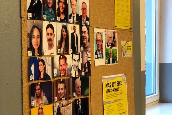 Die Jugendlichen müssen an einer Fotowand im Café herausfinden, bei welchen Personen es sich um Landtagskandidat*innen handelt. Die Ergebnisse werden festgehalten und ausgewertet.